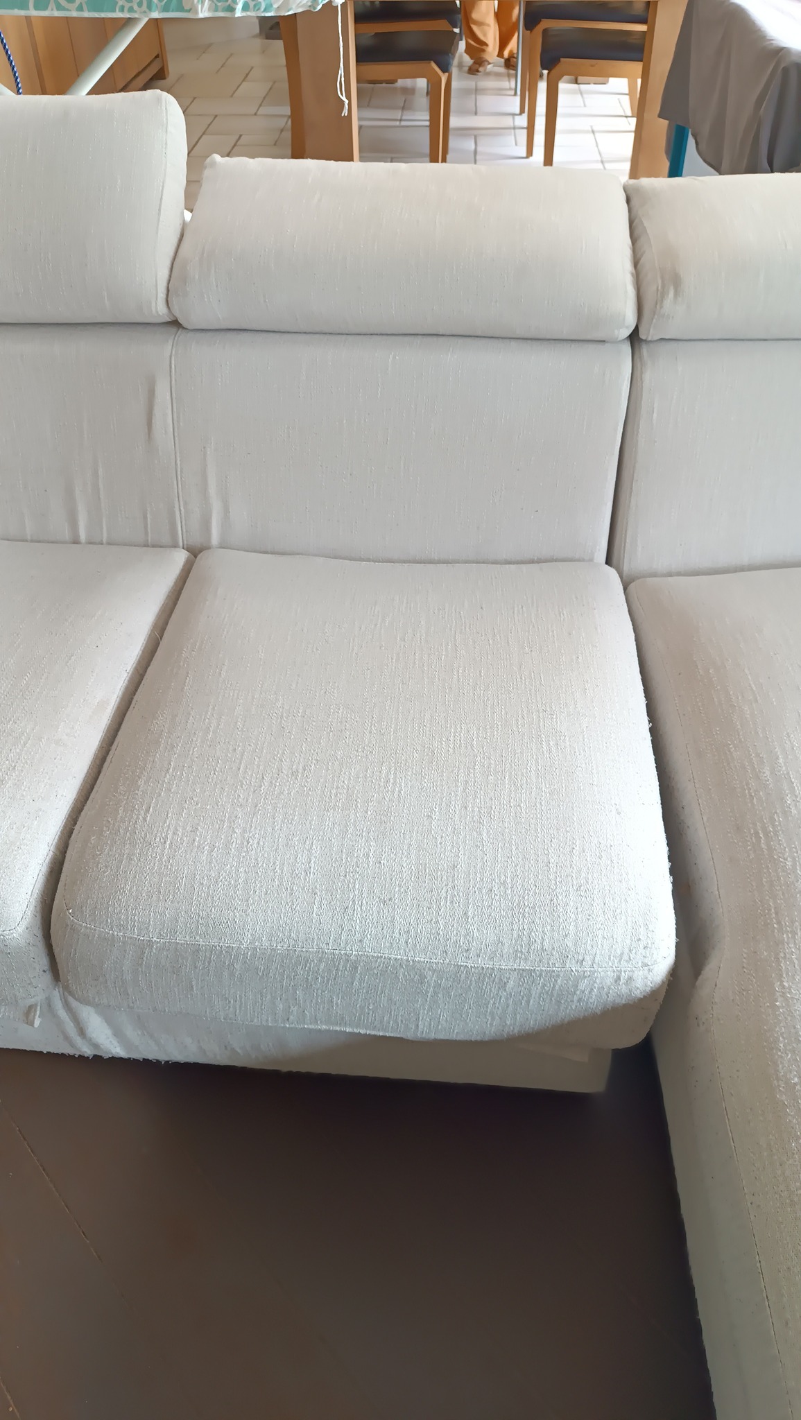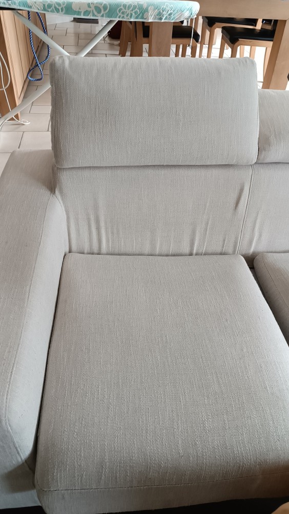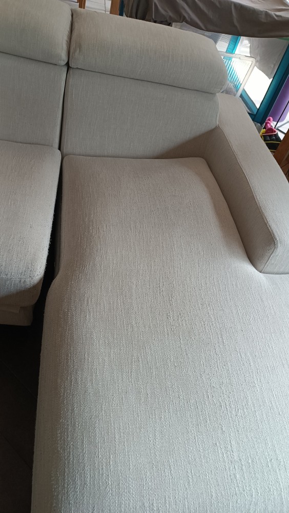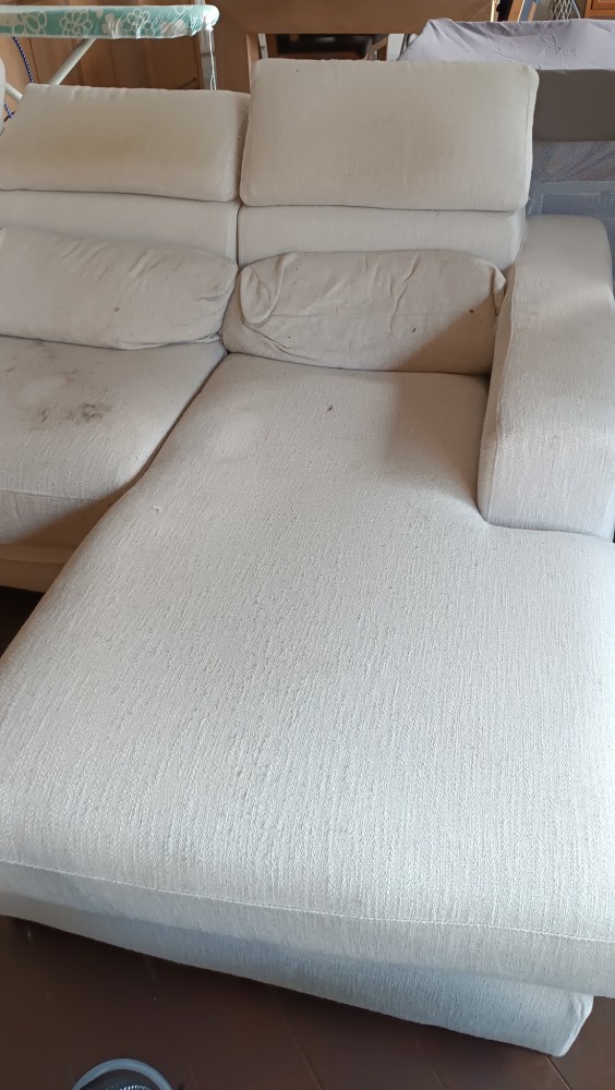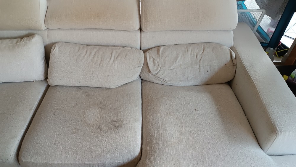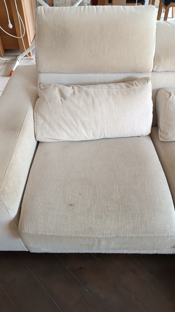 Ce canapé clair montrait les marques du quotidien : taches visibles et tissu assombri.
